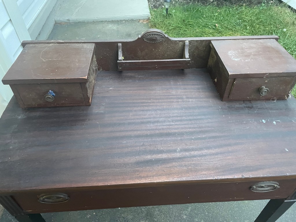 - Desk top and the top of the upper drawer sections were thoroughly sanded with multiple grits to raw wood.