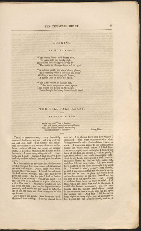 There are no records that reflect Poe’s abilities dwindled while in his new career, but his professionalism and work ethic were called into question as he developed an unfortunate habit of alcohol abuse. At the age of twenty-seven, Poe married his thirteen-year old cousin Virginia Clemm. The exact nature of their relationship is unknown. It is unclear if there was romance or just familial love and respect between the two, but nonetheless they were now bound together by law. Seemingly unable to remain in one location for too long, Poe leaves Richmond, Virginia to migrate to Philadelphia, Pennsylvania. He manufactured many of his most famous works here; “The Tell Tale Heart,” the “Masque of the Red Death,” “The Black Cat,” “The Pit and the Pendulum,” “The Gold Bug,” “The Fall of the House of Usher,” and “The Murder in the Rue Morgue.” All of these stories would ultimately go down in history as prodigious narratives, especially, “The Murder in the Rue Morgue,” which became dubbed as the first-ever detective story and an inspiration for the infamous fictional “Sherlock Holmes,” storyline that was invented years later. As his success expanded, as did his access to professional opportunities. For the next few years, Poe would waver between working at magazine editing and writing literary criticisms, quitting to then chase his dream of owning his own magazine, before then returning to another place of employment when the plan flopped. During these tumultuous years, his young wife also began to exhibit signs of sickness. Fortunately, for both Virginia and Poe, “His mother-in-law was an important source of strength to the couple during these years.” (Minor 2010) With Clemm’s fortitude, Poe was able to overcome the struggles and continue writing.