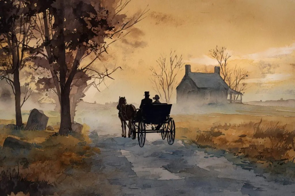 The poem describes a speaker who is taken on a carriage ride by Death, who is portrayed as calm and courteous. As they travel, the speaker passes scenes from life, including children playing, fields of grain, and the setting sun. Eventually, they arrive at a house that represents the speaker’s grave. The speaker reflects that this journey happened long ago and realizes that the ride with Death marked the transition from life to eternity.